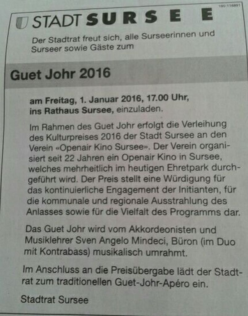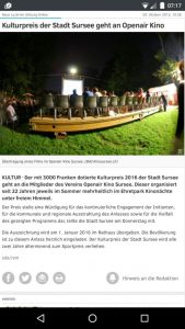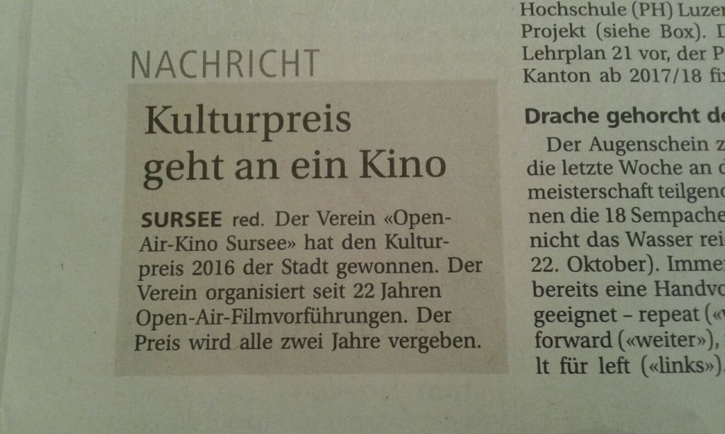 2016 erhält das Openair Kino Sursee den Titel als Kulturpreisträger der Stadt Sursee. Wir sind unglaublich stolz! Vielen Dank!
